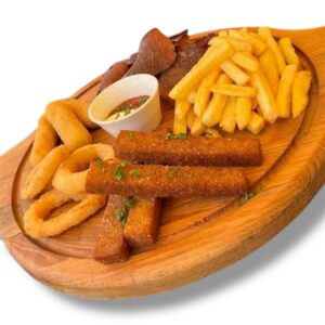 Картошка фри 100г. Луковые кольца 3 шт. Сырные палочки 3 шт. Чипсы 50г. (свиные и говяжьи по 25г.) Гренки чесночные 4 шт. Соус майонез с кетчупом
