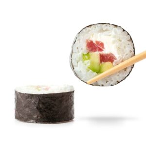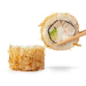 Рис, нори, сыр, креветки, авокадо, омлет томаго, стружка тунца