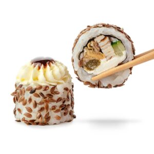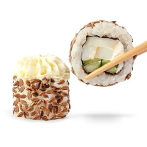 Рис, нори, сыр, кальмар, огурец, лён, сливочная шапочка