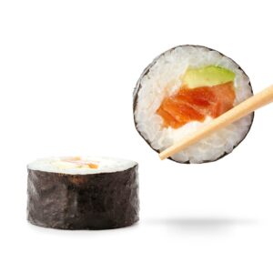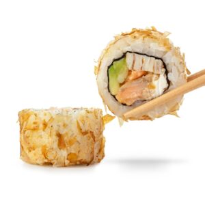 Рис, нори, сыр, лосось терияки, авокадо, омлет томаго, лён, сливочная шапочка, соус кимчи