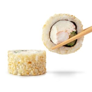 Рис, нори, сыр, снежный краб, креветки, огурец, кунжут