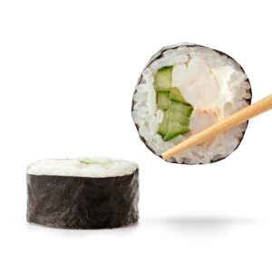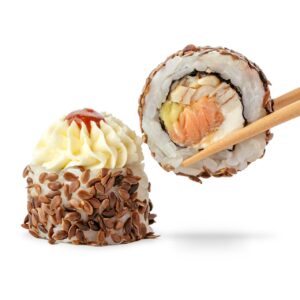 Рис, нори, сыр, кальмар, огурец, лён, сливочная шапочка