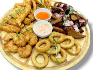 Креветки в темпуре, Сырные палочки, Кальмар в темпуре, Гренки с беконом, Луковые колечки, соус спайси, соус манго-чили