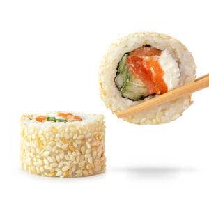 Рис, нори, сыр, лосось, огурец, кунжут