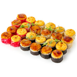 • ГРИЛЬ МИД — крем краб, мидии, дайкон, фирменная запеченная шапочка, кунжут черный.
