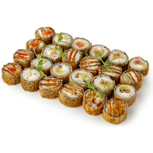 • ТАР ЭБИ — сыр, огурец, омлет томаго, икра масаго, тартар из креветки, сладкий соус Чили и икра масаго.